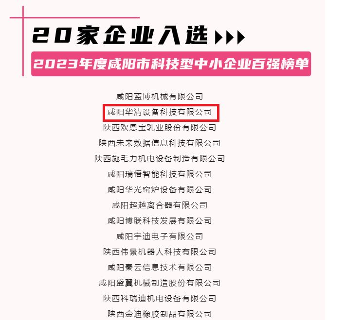 • 2024-02-20熱烈祝賀咸陽華清設(shè)備科技有限公司榮獲2023年度咸陽市科技型中小企業(yè)榜單